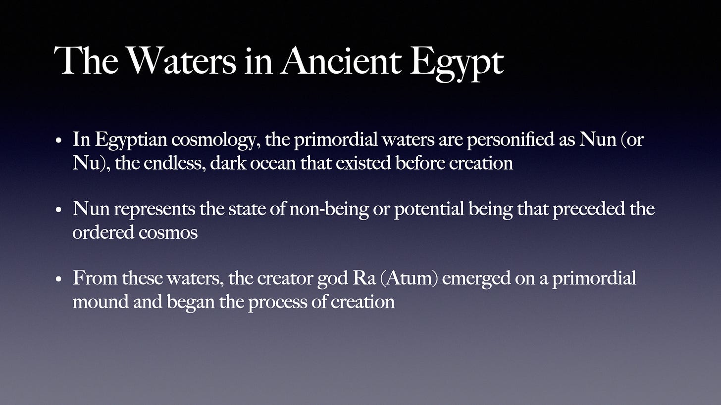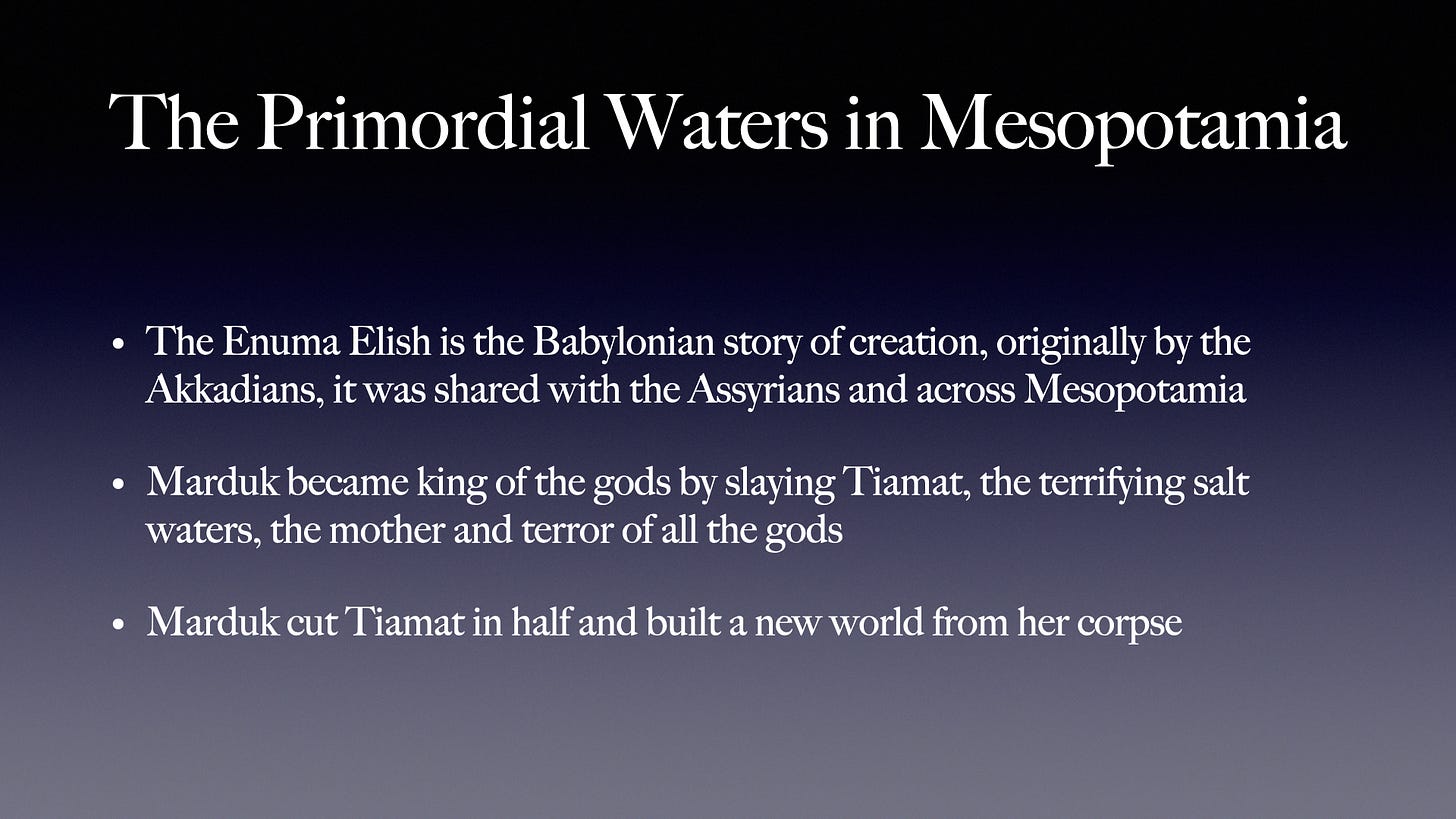 I argue that these Biblical waters of creation are equivalent to the chaotic waters of creation found in the neighboring cultures of Egypt, Mesopotamia, and India, where the mother goddess was strong.