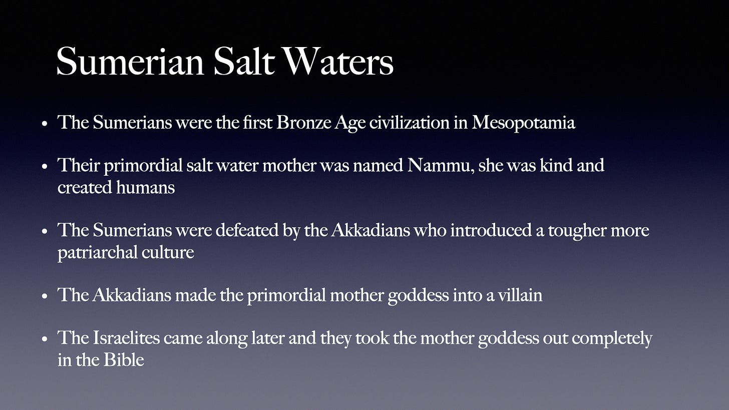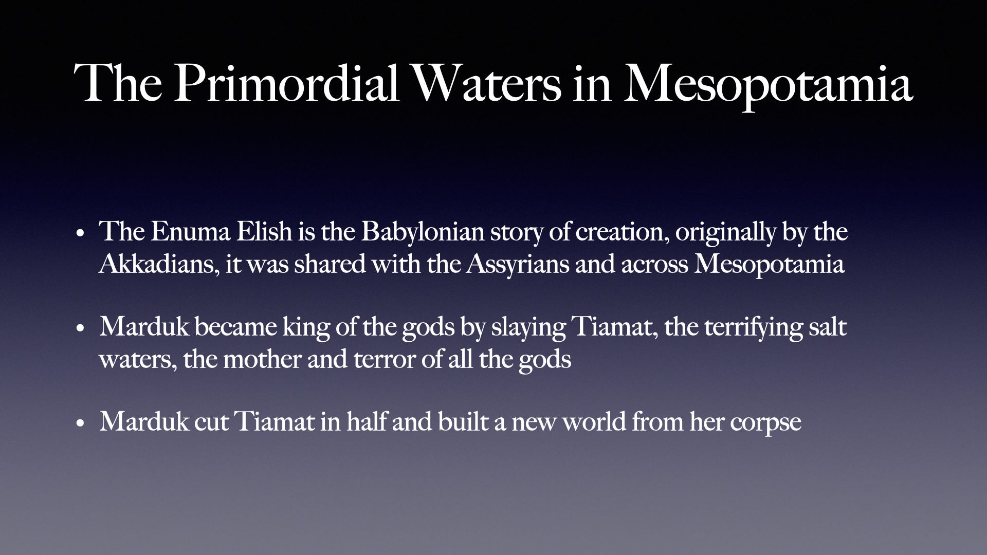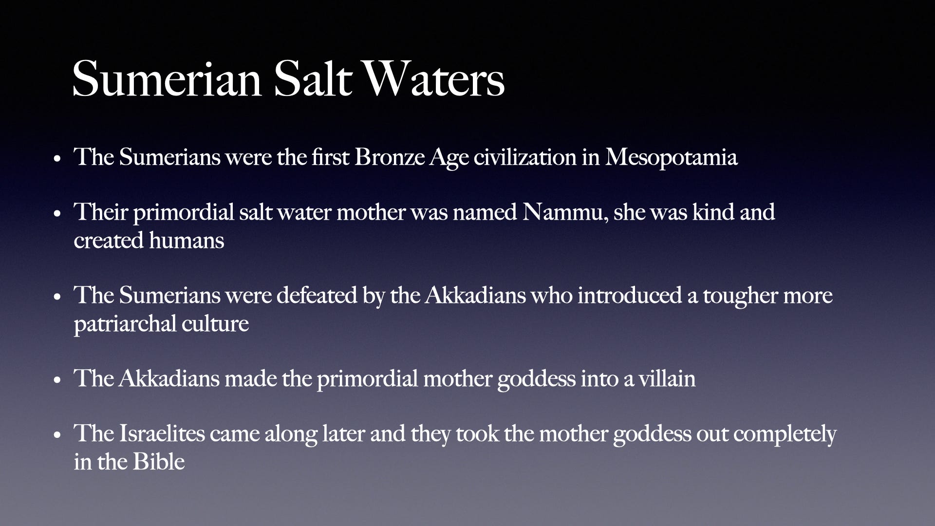 Mesopotamian cultures explicitly understood the chaotic waters of creation to be the original mother goddess, the virgin mother of the universe who birthed her own mate and all the gods.